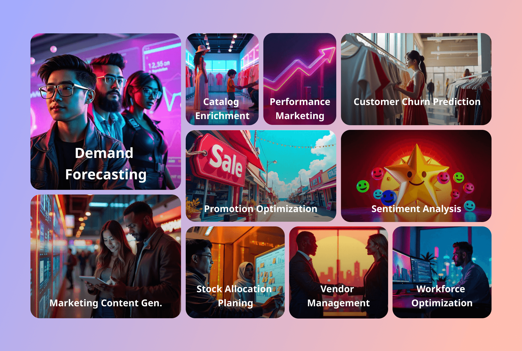 งานจัดการสินค้าหลังบ้าน : มีการนำ AI เข้าไปใช้ในการจัดการคลลังสินค้า การคาดการ ความต้องการของลูกค้าในแต่ละช่วงให้แม่นยำมากขึ้น ลดระยะเวลาการทำงานของหลังบ้านลง ภาระงานที่ต้องทำซ้ำๆ เดิมๆ ให้เข้าสู่ระบบอัตโนมัติมากขึ้น แต่ก็ไม่ลืมที่จะใช้คนในการ audit กระบวนการต่างๆจาก AI